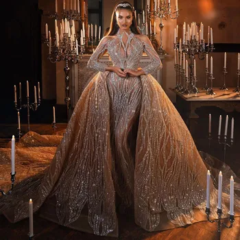 Luxury High End Arab Bride Ladies Wedding Party Beach Wedding Dubai Sweeping Train Long Sleeve Shiny Vestido De Novia