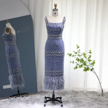 Luxury Crystal Feathers Dubai Evening Dresses for Women Wedding Elegant Blue Lace Midi Arabic Formal Party Gown Standard Size