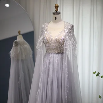 Luxury Dubai Silver Grey Evening Dresses with Feather Cape Shawl Arabic Women Wedding Party Formal Prom Dress Custom Made Size