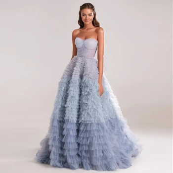 Chic Blue Ombre Tiered Ruffles Evening Dresses, Luxury Dubai Ball Gown Prom Dress for Women Wedding Party Custom Made Size