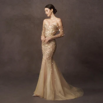 Luxury Dubai Champagne Gold Mermaid Evening Dress with Detachable Overskirt Off Shoulder Arabic Wedding Party