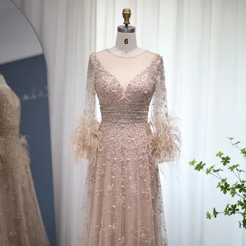 Elegant Champagne Feathers Long Sleeves Evening Dresses Luxury Dubai Beaded Muslim Women Wedding Formal Party Gowns