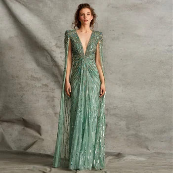 Dubai Luxury Crystal Sage Green Evening Dresses with Cape Fuchsia Gold Elegant Women Wedding Dress Party Gowns