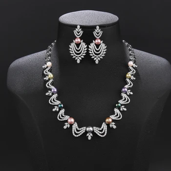 Luxury Colors Pearl Necklace Earring Set White Cubic Zirconia Wedding Bridal Party Jewelry Sets For Women