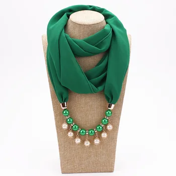 Women Chiffon Neckerchief Hijabs Scarf Necklaces Beads Pearls Solid Color Jewelry Shawl Pendant Scarves Bohemia Head Scarf