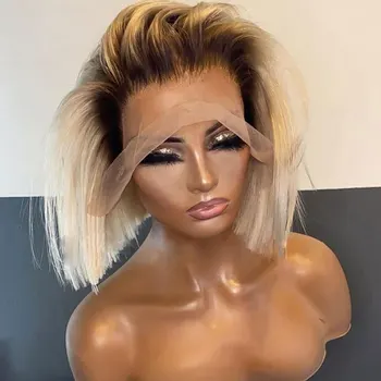 Short Bob Wig Ombre Blonde Lace Front Synthetic Wigs For Women Straight 150 Density 13×3 Colored Dark Roots Glueless Wig