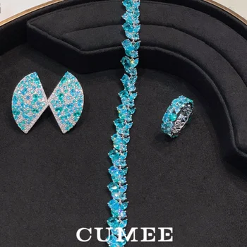 Fine Jewelry Artificial Sea Blue Aquamarine Gemstone Bracelet Set Women 925 Silver Gold Plating
