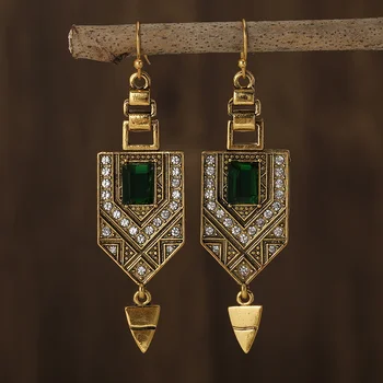 Fashion BOHO Green Glass Crystal Rhinestone Dangle Women Ancient Gold Color Wear Ear Band Long Tassel Earrings