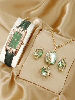 5PCS Set Fashion Women Rectangle Watches Ladies Business Green Leather Quartz Watch Womens Necklace Earrings Bracelet Wristwatch