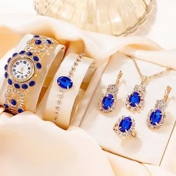 6PCS Set Luxury Watch Women Ring Necklace Earring Rhinestone Fashion Wristwatch Casual Ladies Watches Bracelet Set Clock