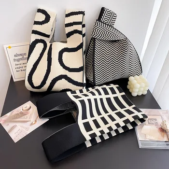 Women’s Knot Wrist Bag Handmade Knitted Bag Portable Mini Striped Tote Bucket Phone Bags Large Capacity Autumn Winter Handbags