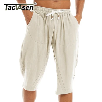 Casual Linen Capri Long Shorts Loose Fit Men’s Cotton Linen Harem Shorts Below Knee Baggy Capri Yoga Fitness 3/4 Pants