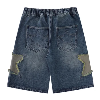 Retro Star Splicing Denim Shorts, Men Summer Harajuku Streetwear Jeans Shorts Fashion Casual Loose Blue Denim Shorts Unisex