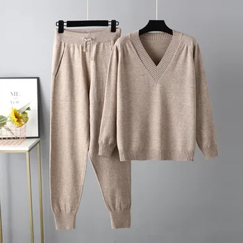 Autumn Winter Women’s V Neck Sweater Two Piece Set Female Knitted Pants Suits Fashion Casual Pullover Tracksuits Outwear