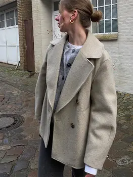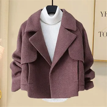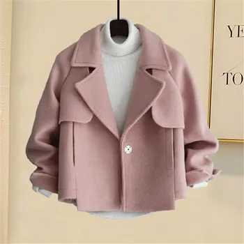 Women’s Autumn New Fashion Gold Button Woollen Jacket Coat Lapel Long-sleeved Pocket Loose Female Short Outwear Chic Tops