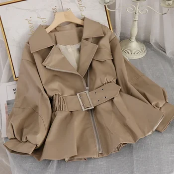 Fall Women Leather Short Jacket Turn-Down Collar Korean Style Fashion Faux Leather PU Coat with Belt Slim Outwear Full