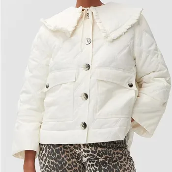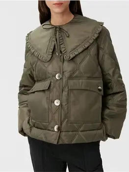 Ruffled Quilting Short Type Parkas Coat Women 3 Colors Turn-down Collar Cardigan Long Sleeve Single Breasted Female Jacket