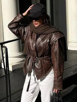 Fashion Leather Woman Short Jacket With Belt Loose Turn Down Collar Long Sleeve Coat Ladies Winter Elegant Warm Street Outerwear