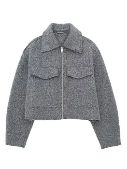 Spring Turn-down Collar Cropped Jacket For Women Elegant Warm Short Coats Female Street Zipper Long Sleeve Pocket Outerwear