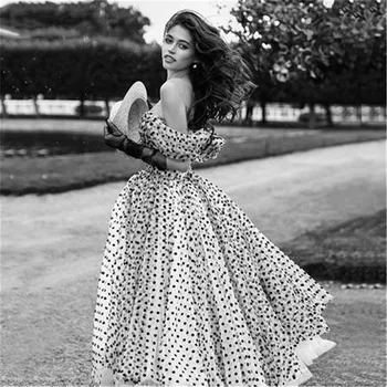 A Line Black Dots Tulle Prom Dresses Formal Evening Gowns Sweetheart Off The Shoulder Women Wedding Party Bridesmaid Gown