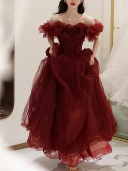 A Word Shoulder Fairy Red Boat Neck Evening Dresses Elegant Slim Waist Long Temperament Prom Robe Niche Wedding Party Dress