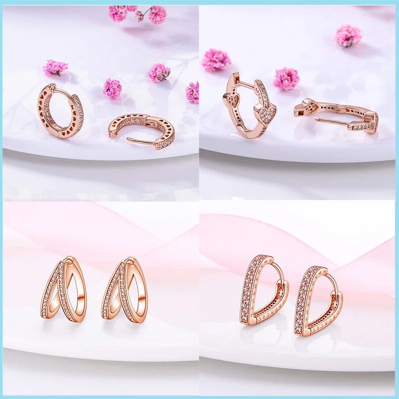 100% 925 Sterling Silver Rose Gold Heart Geometric Pave CZ Hoop Earrings for Women Wedding Engagement Birthday Jewelry Gift