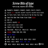 Torx: T3, T3, T4, T4, T5, T5, T6, T6, T7, T7, T8, T8, T9, T9, T10, T10, T15, T15, T20, and T20