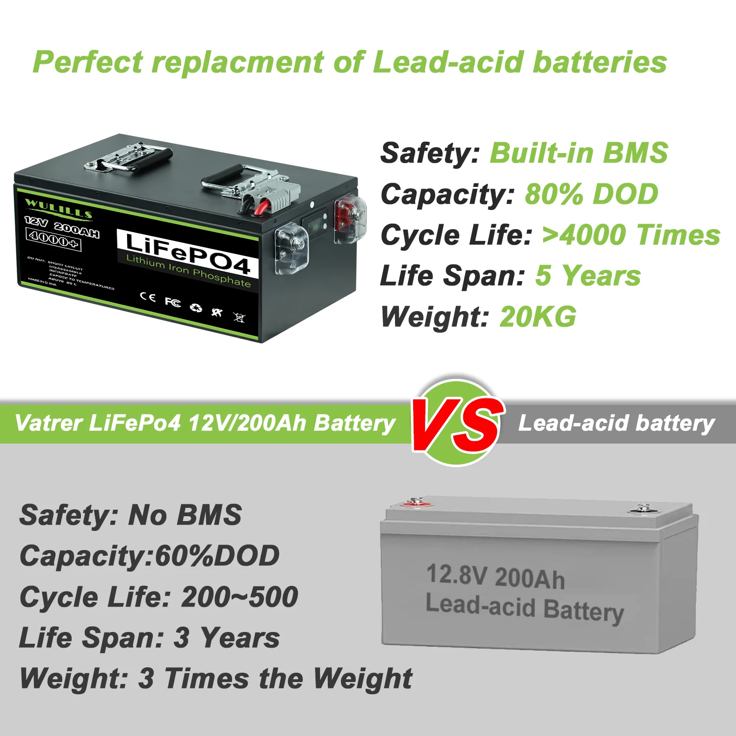 Our LiFePO4 battery has built-in BMS (Battery Management System) to protect it from overcharge, over-discharge, over-current, and short circuit with excellent self-discharge rate. Built-in high temp cut off prevents charging over 122 °F (50 °C). Plus, Li-Ion batteries can be safer than Lead Acid batteries, which have no protection against ground faults. This product fits for outdoor camping power and indoor easy installation.