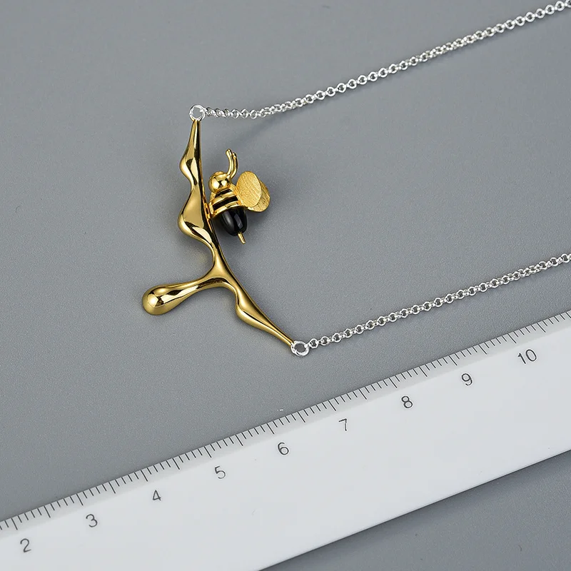 18K Gold Bee and Dripping Honey Pendant Necklace Real 925 Sterling Silver Handmade Designer Fine Jewelry for Women
