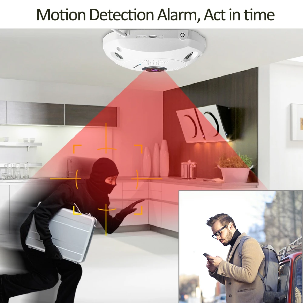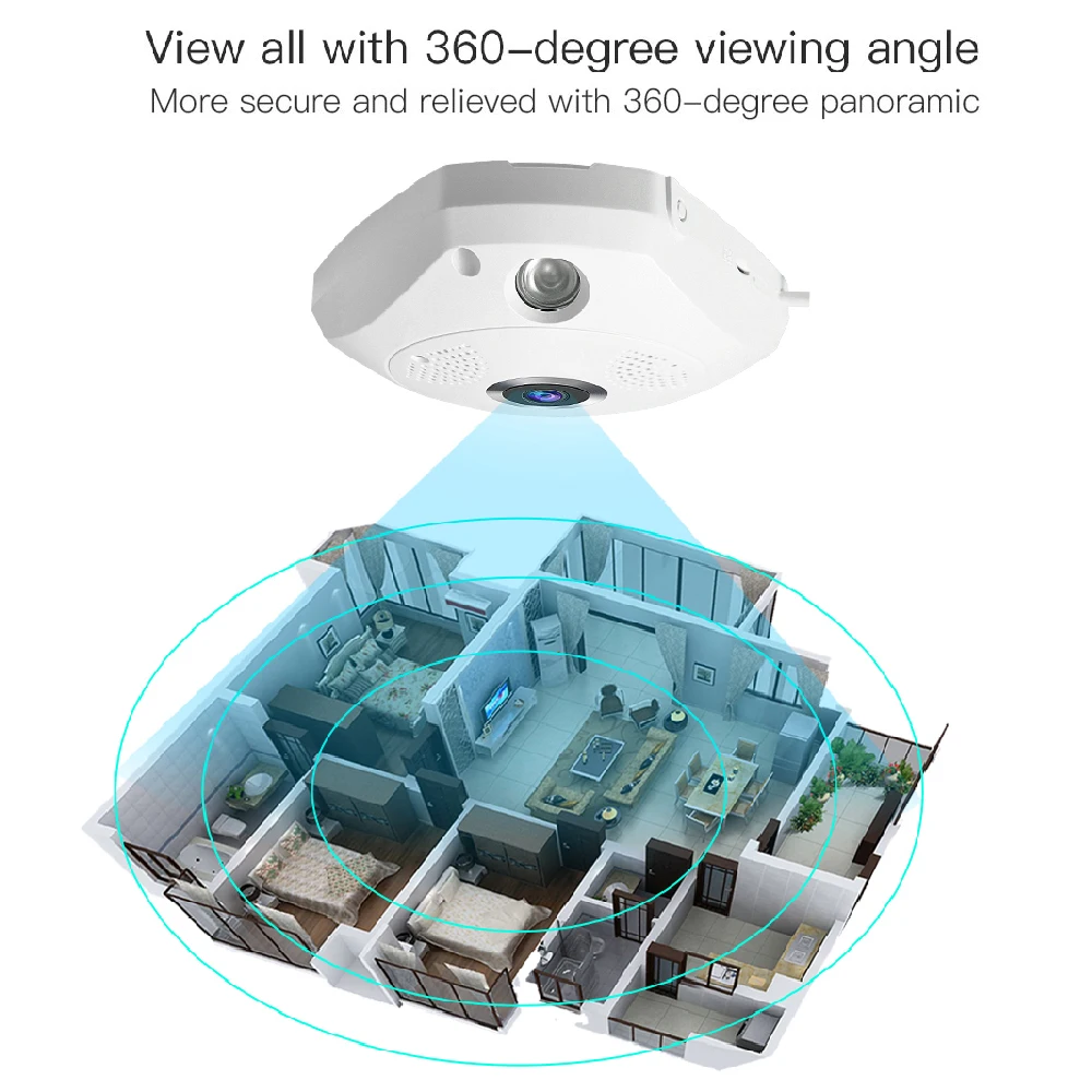360 degree Panorama Camera: The horizontal and vertical viewing angles of the fish-eye lens are all 180 degree, give your house 360° panoramic surveillance protection.