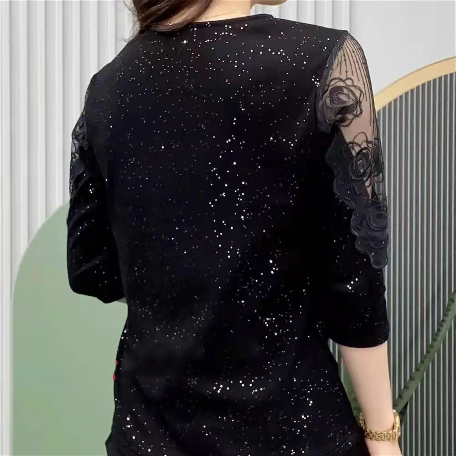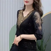 4XL Women Summer Spring Autumn Blouses Shirts Lady Fashion Half Sleeve V-Neck Collar Sequins Lace Embroidery Blusas Tops