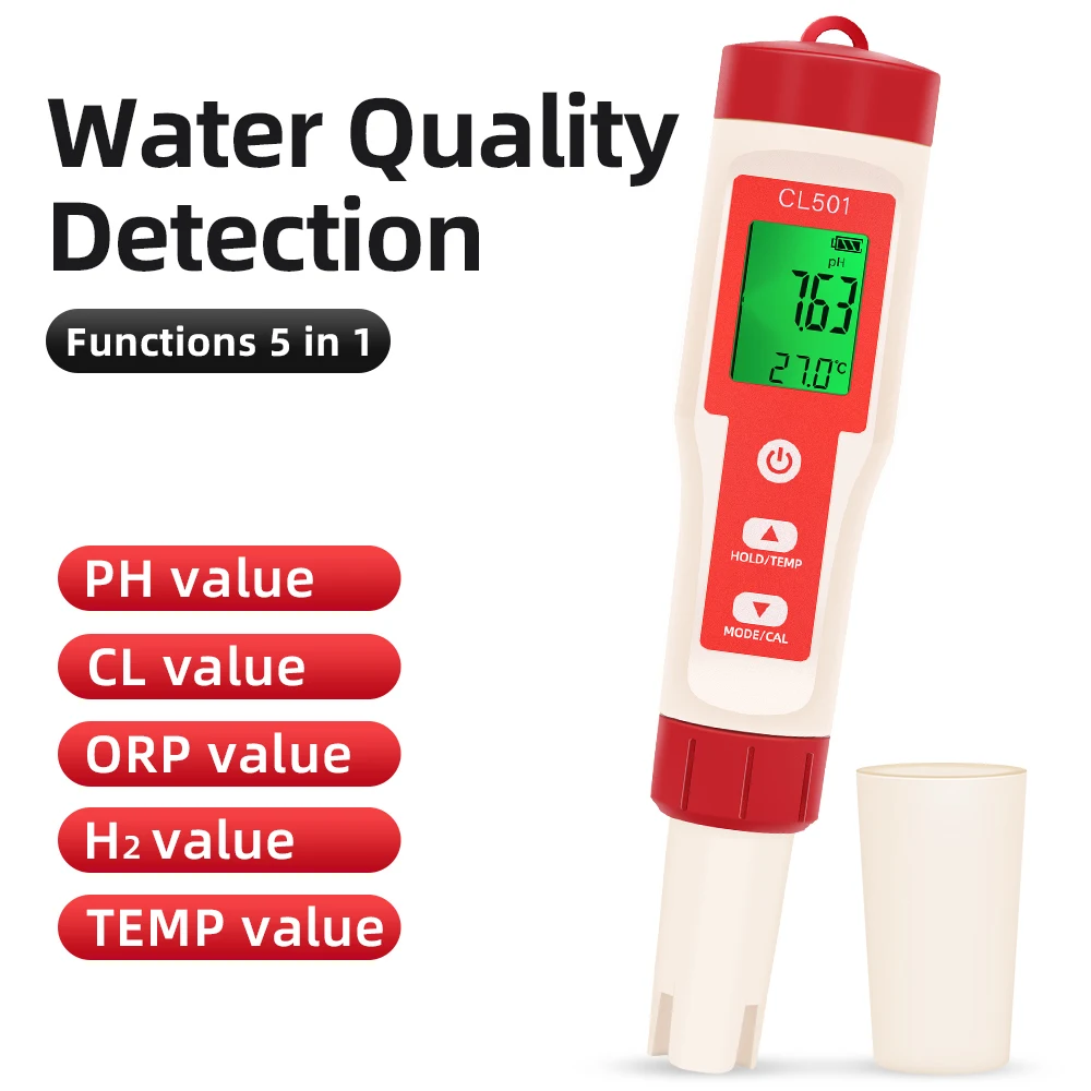5 in 1 Chlorine Meter Pen Water Quality Detector PH, H2, ORP TEMP CL2 Tester Multi-function Spa Swimming Pool Chlorine Monitor