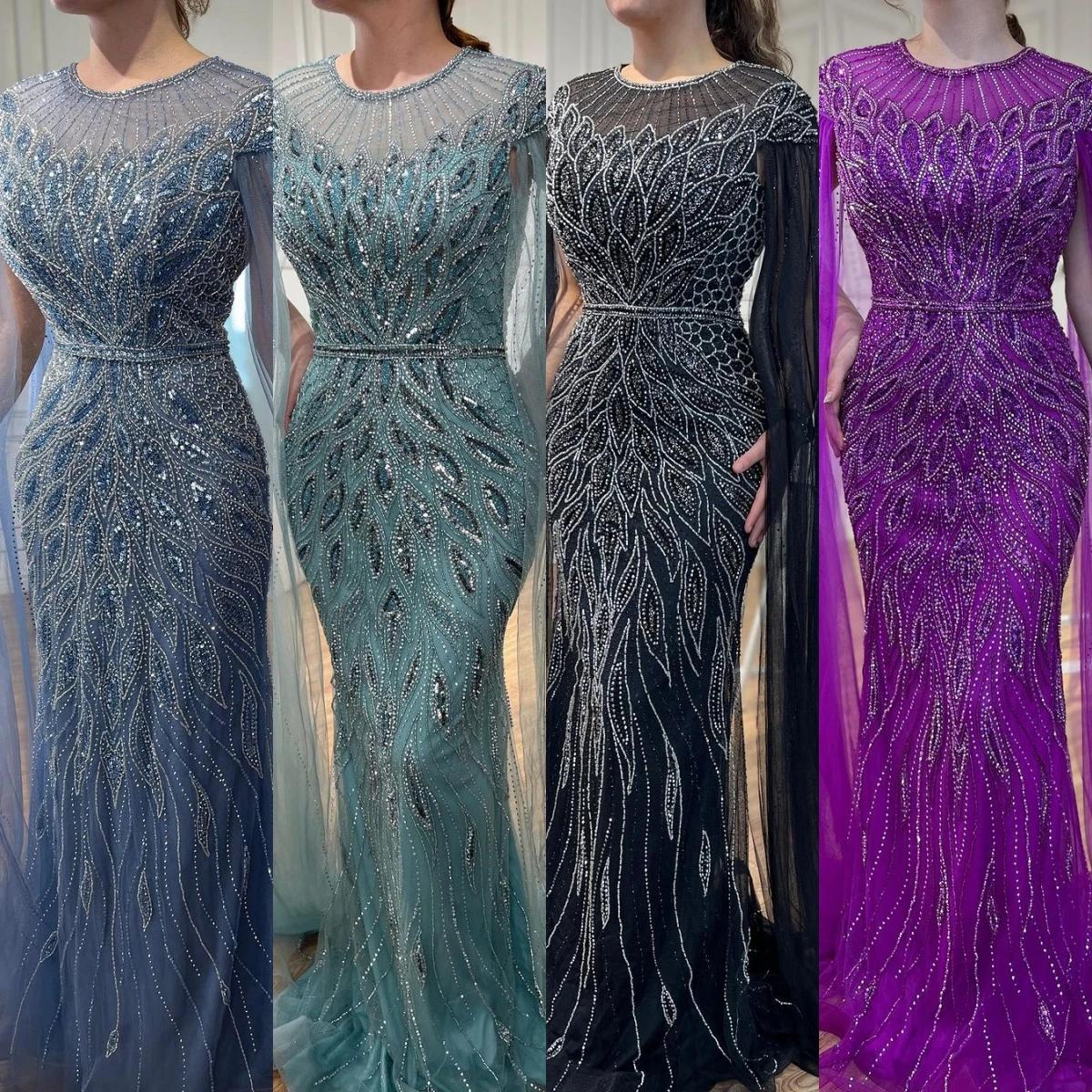 Arabic Blue Cape Sleeves Mermaid Beaded Luxury Long Evening Dresses Gowns for Women Wedding Party