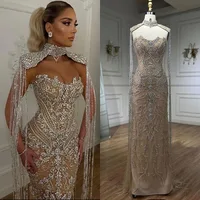 Arabic Silver Nude Mermaid Strapless Tassel Beaded Luxury Evening Dresses Gowns For Women Wedding Party