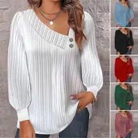 Autumn/Winter New Simple V-neck T-shirt Women’s Solid Color Long Sleeve Shirt Shirt Oblique Neck Button Top Pullover