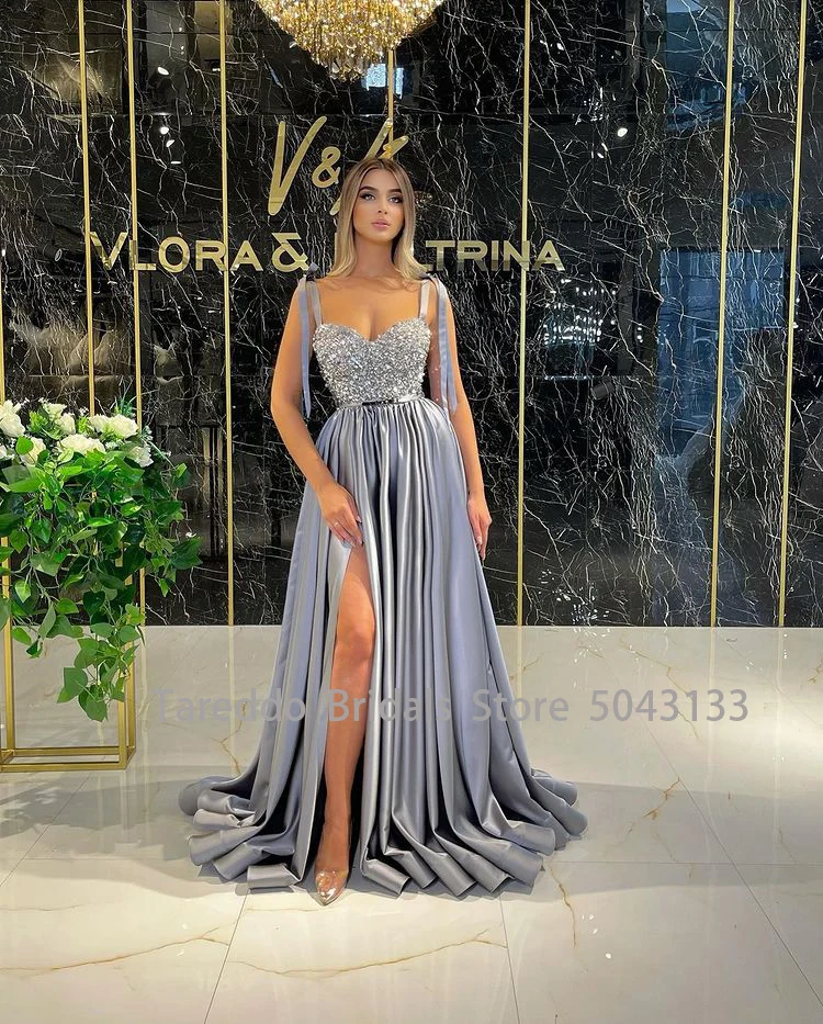 Beading Satin High Slit Evening Dresses with Spaghetti Straps Sexy Pleats Long Corset Backless Wedding Prom Party Gowns