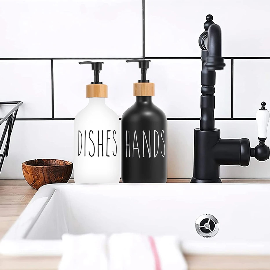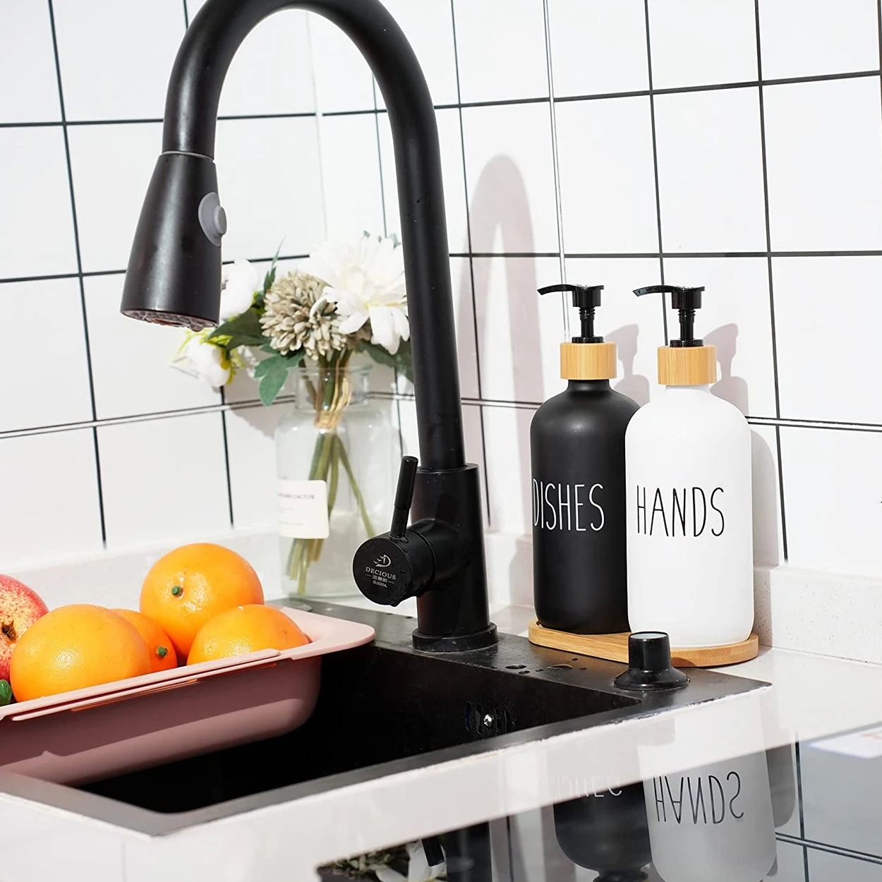 Black Dish Soap Dispenser Hands Bottle Kitchen Dishes Detergent Storage Refillable Bathroom Shampoo Bottles with Bamboo Pump