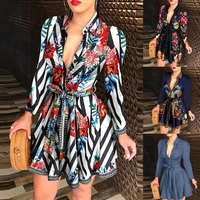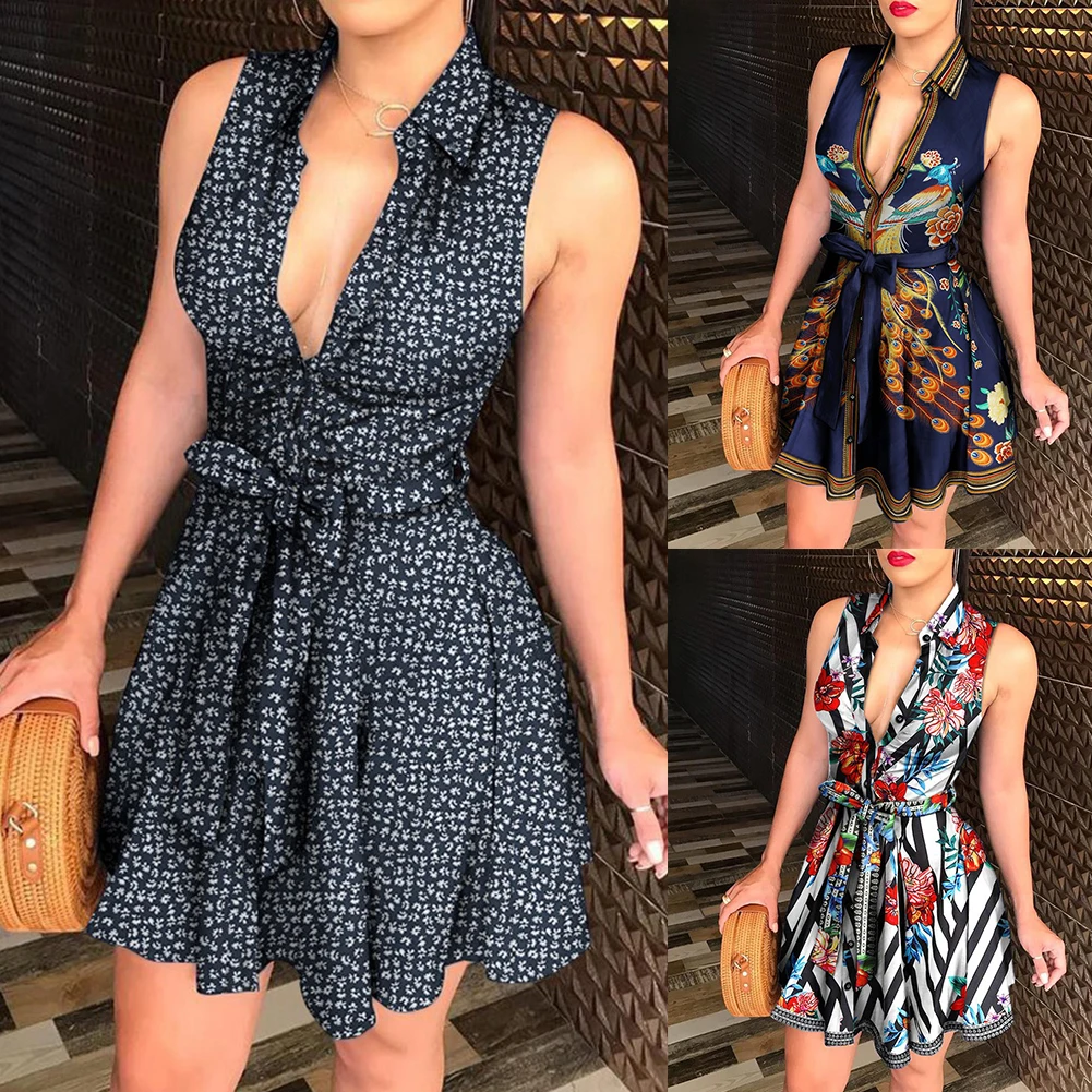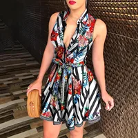 Women Vintage V Neck Sleeveless Polka Dots Floral Print Belt Party Mini Dress