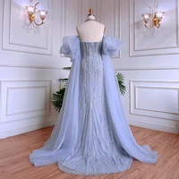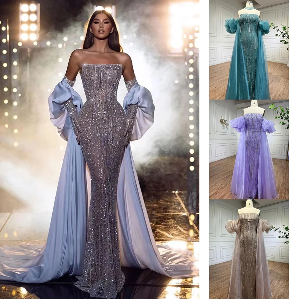 Blue Sexy Strapless Mermaid Sparkly Puff Sleeves Crystal Beaded Evening Dresses Gowns For Women Party