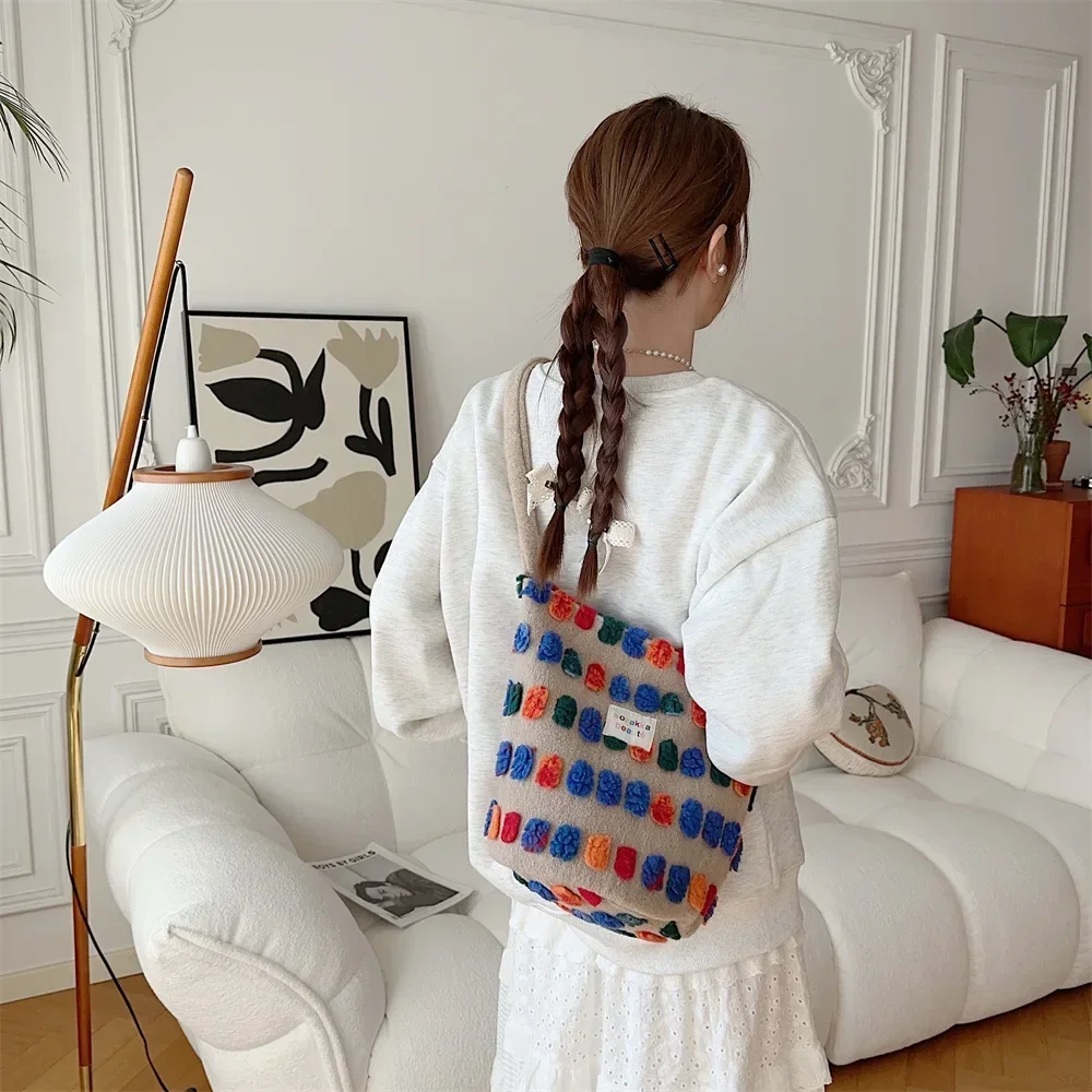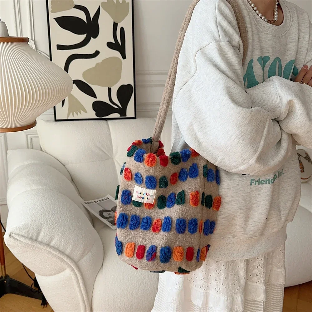 Color Plush Dots Women’s Bento Handbags Retro Design Female Fluffy Bucket Bags Large Capacity Shoulder Bag Purse Casual Tote