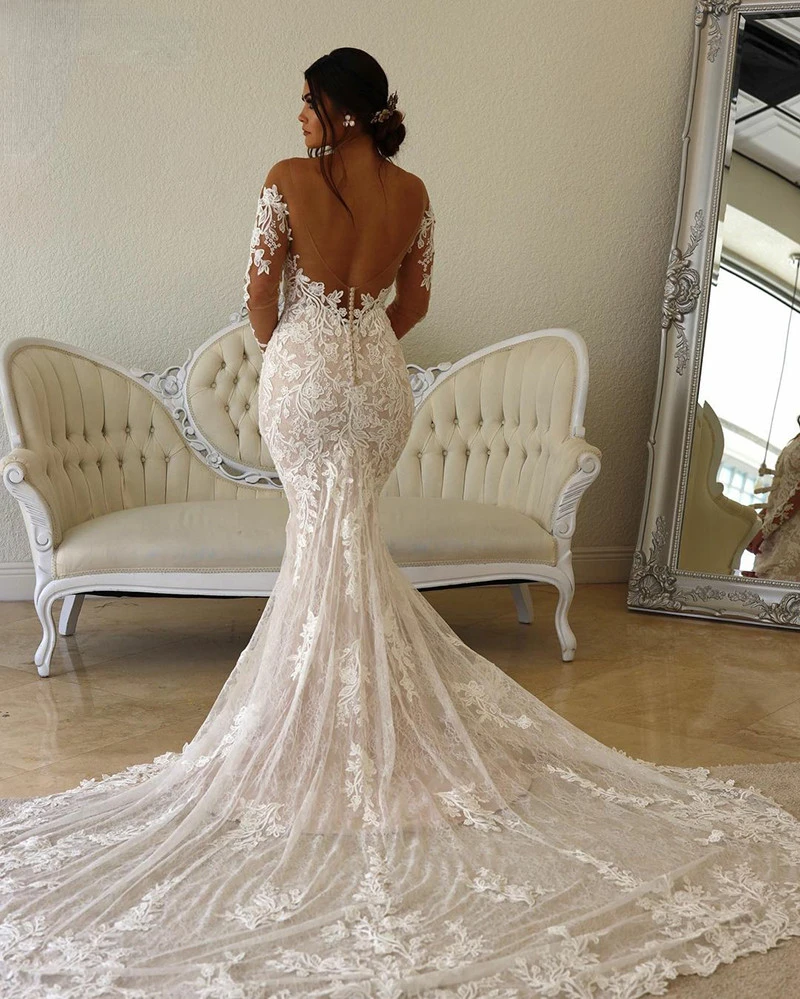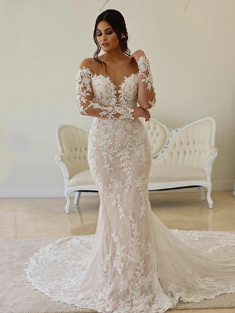 Custom Made Obe De Mariée En Dentelle, Style Boho, Illusion De Sirène, Corsage, Manches Longues, Col Transparent