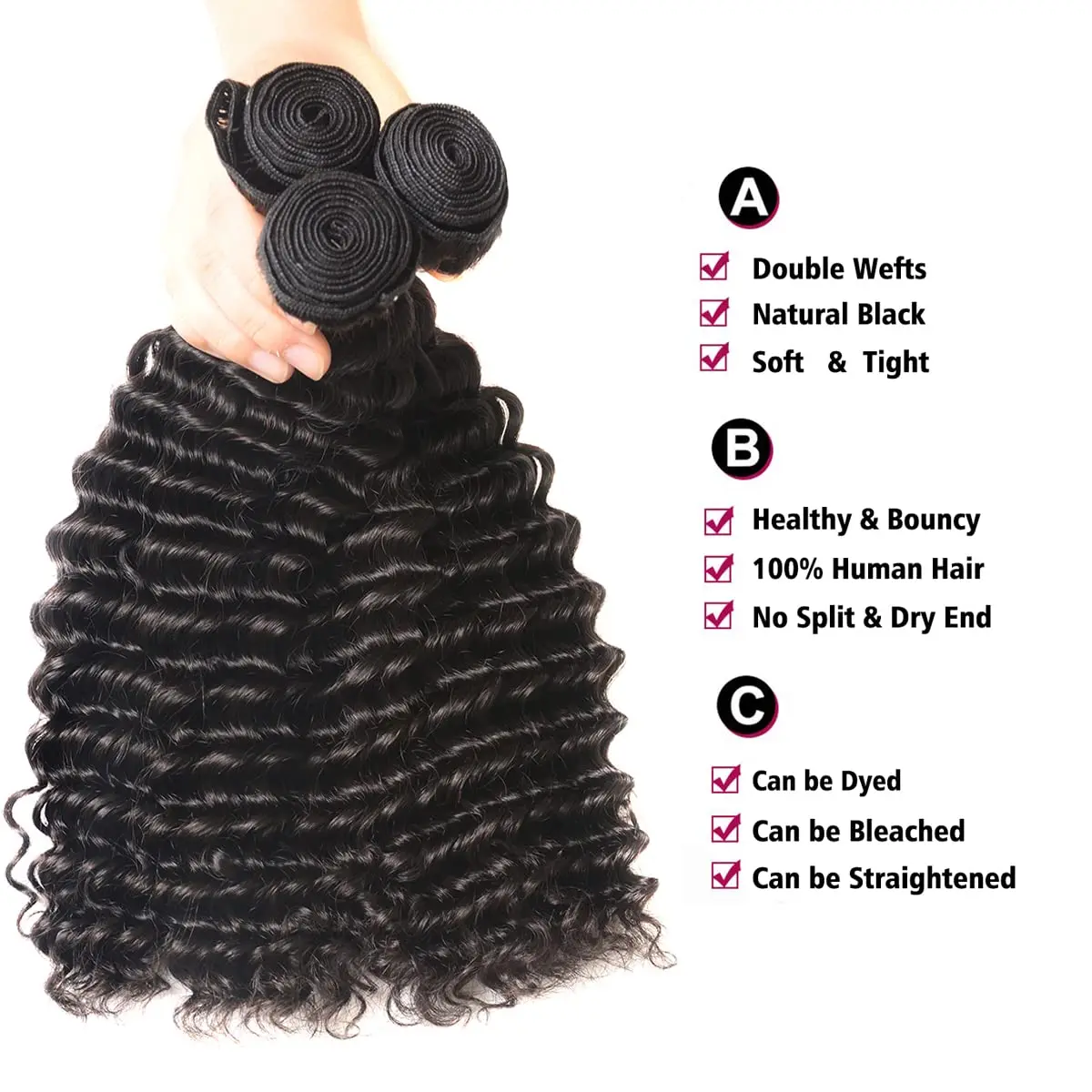–Hair Material: Brazilian Deep Wave 1-3-4 Bundles, Made of 100% Unprocessed Human Hair Extensions, Grade 9A Virgin Hair.