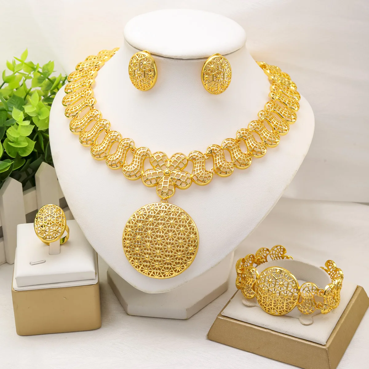 Dubai 24k gold jewelry African Bead Jewelry Sets for Woman Party Wedding Accessories Golden Color Necklace Ring Bangle Earrings