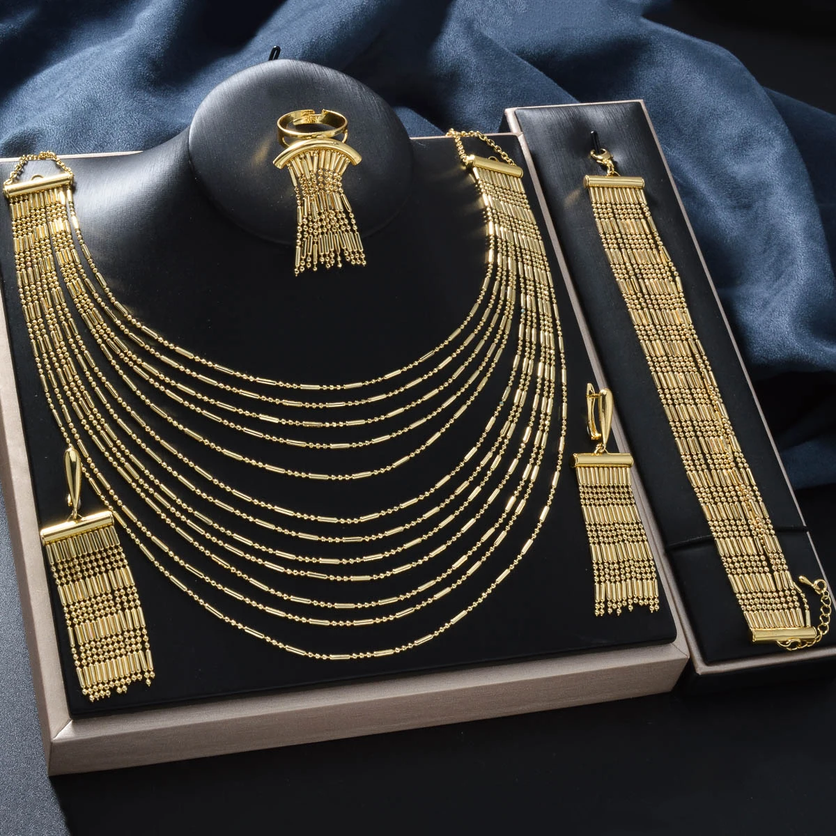 Dubai Luxury Style 18K Gold-Plated Jewelry Four-Piece Set Multi-Layer Necklace Stackable Bracelet Earrings Ring for Wedding Gift
