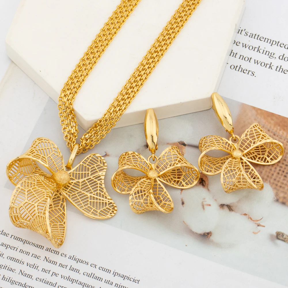 Dubai Fashion Women's Flower Sweater Long Necklace 24K Gold-Plated Middle Eastern Luxury Flower Earrings Copper Jewelry Two-Pieces