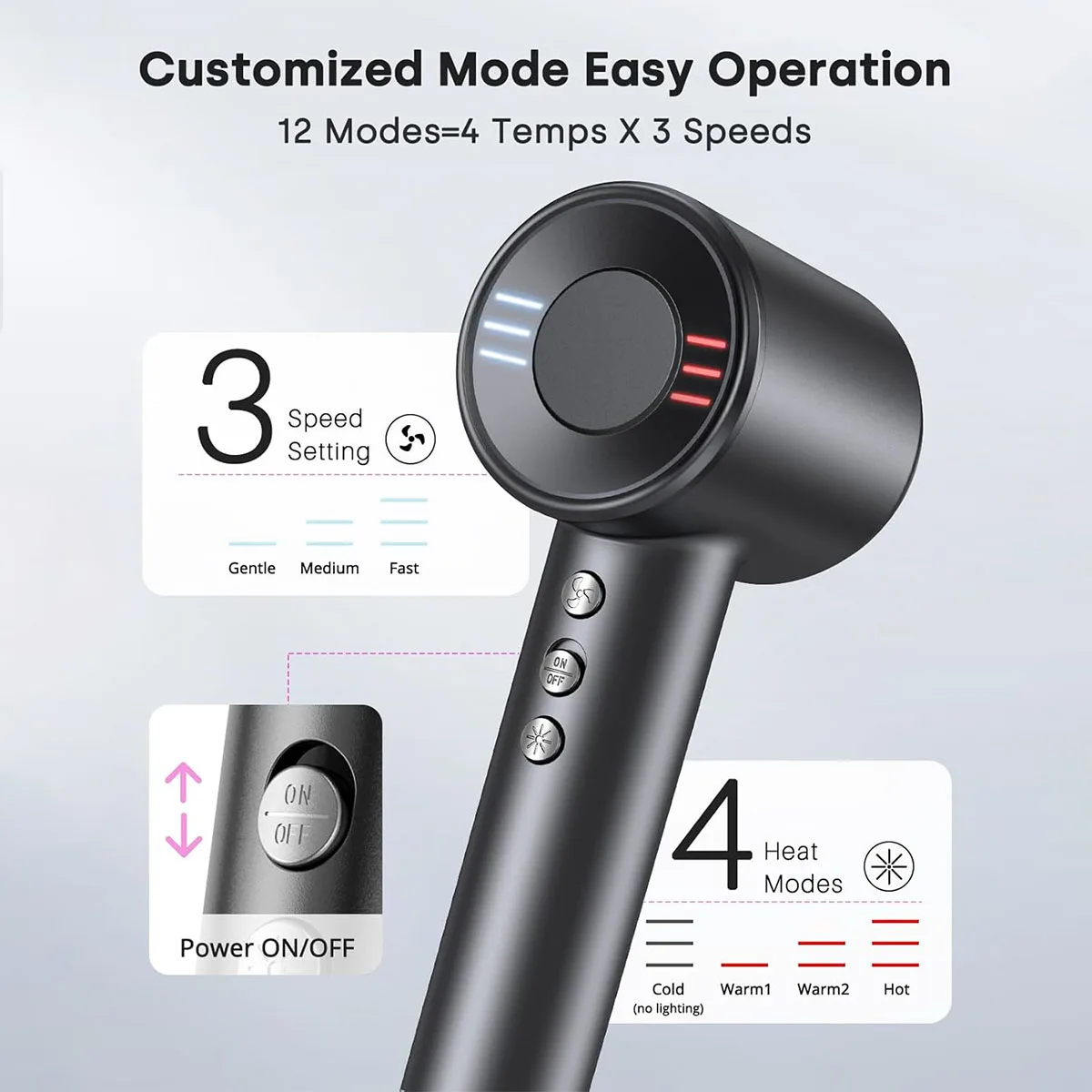 4. 【Perfect for All Hair Type】 Our hair dryer is equipped with 4 temperature settings and 3 speed options, allowing you to find the most comfortable drying experience tailored to your needs. Whether your hair is curly, thick, or fine, it adapts seamlessly to provide optimal care. Additionally, it features an smart intelligent temperature control sensor that adjusts the temperature 100 times per second, maintaining a consistent heat level to keep your hair drying without damage.