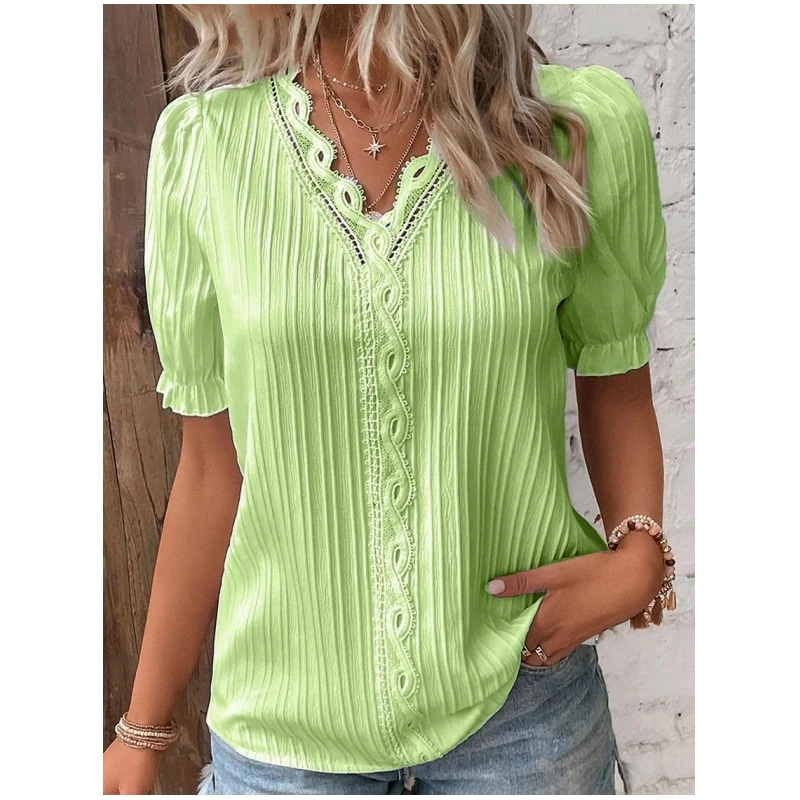 Elegant Blouse Solid Shirt Lace Summer Fashion Hollow Short Sleeve Pullover Top Office Lady Shirt S-5XL