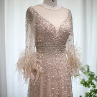 Elegant Champagne Feathers Long Sleeves Evening Dresses Luxury Dubai Beaded Muslim Women Wedding Formal Party Gowns