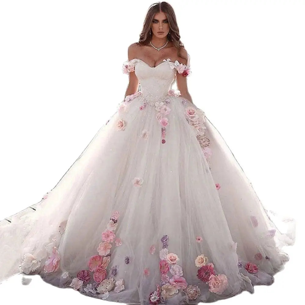 Elegant Ivory White Bride Dresses Halter Pleated Pongee Skirt 3D Flowers Wedding Dress