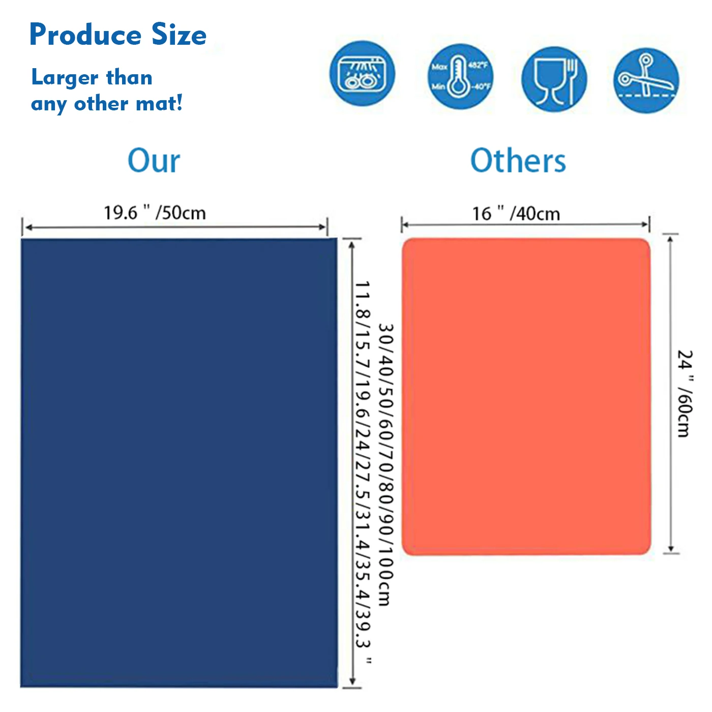LARGEST SILICONE MAT: Multiple sizes: 30-100cm length, 50cm wide, 0.5mm thickness. This largest silicon mat available to meet your needs about protect all sizes counter top. Its big enough for kid lie on the mat or two toddlers to play side by side.